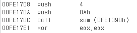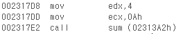 메인 함수에서 인자 10과 4를 sum함수에 전달한다. sum 함수는 전달된 인자를 더하여 값을 반환한다. 이때 메인함수를 어셈블리어로 확인하면 다음과 같다.
