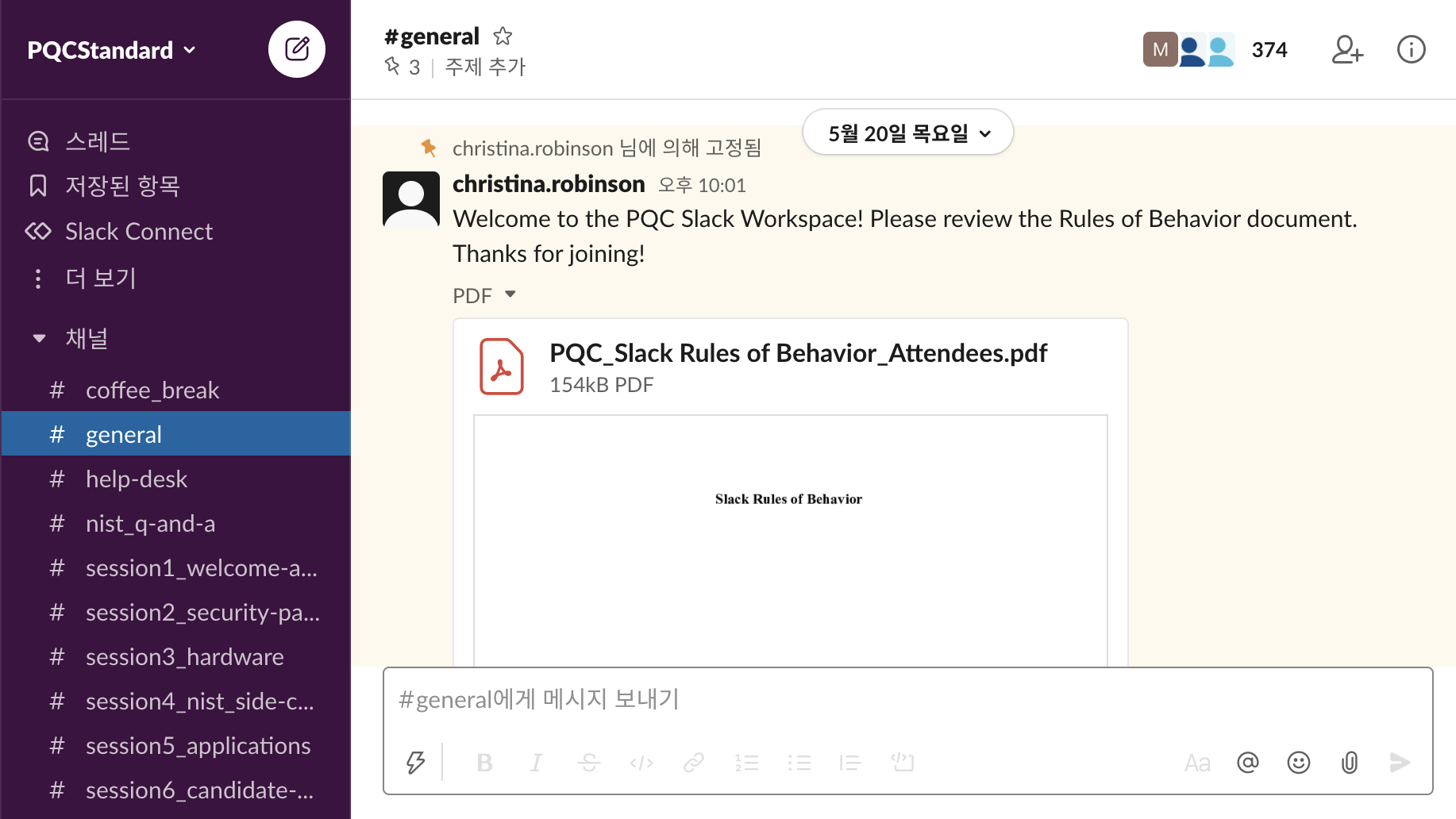 질문과 답변은 Slack을 사용했습니다. 세션별로 채널이 개설되었고 온라인으로 질문과 답변이 기록되어 편한 느낌을 받았습니다. 2주 뒤 삭제 예정입니다.