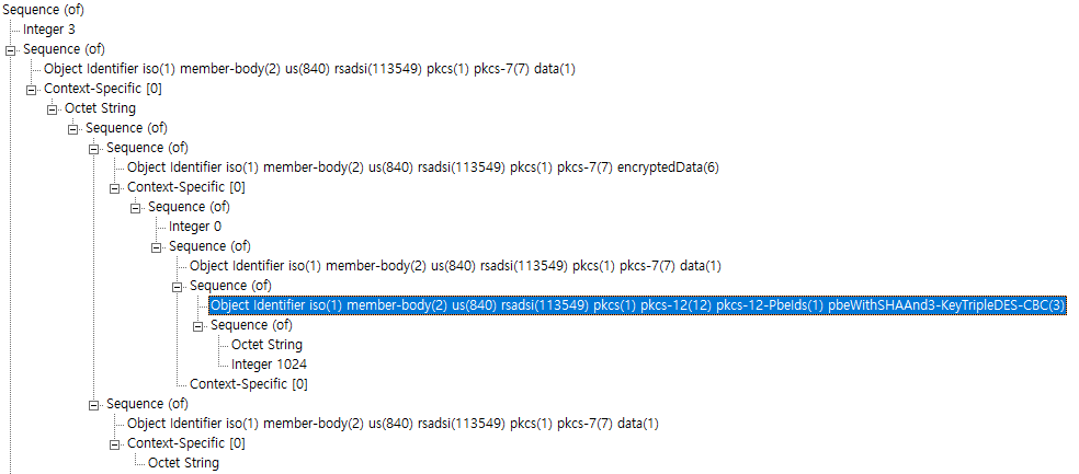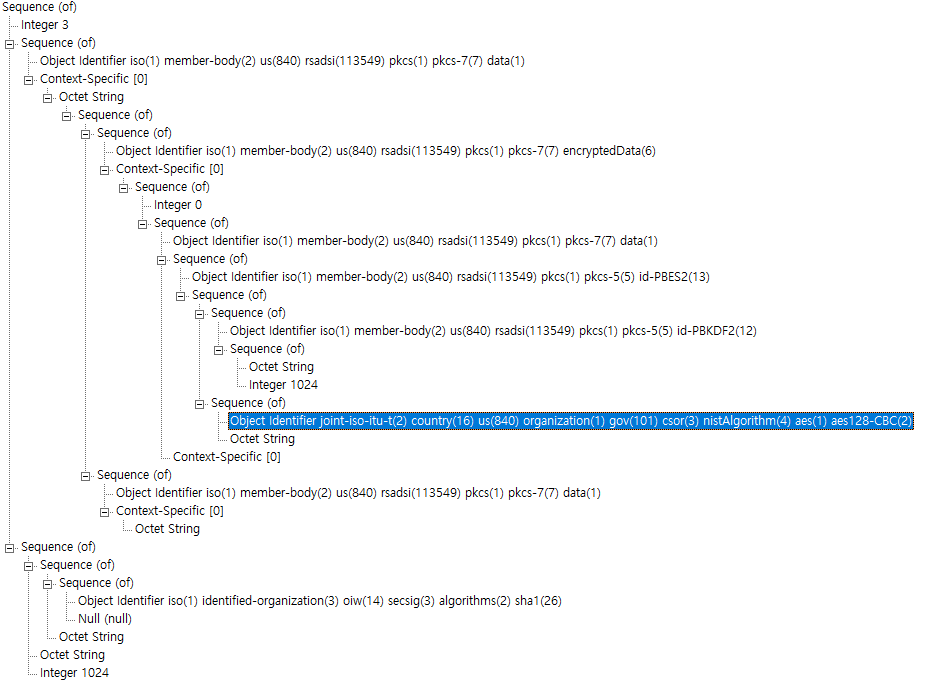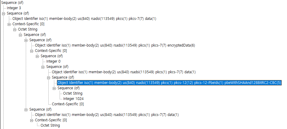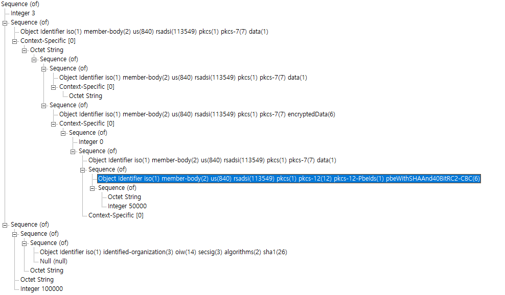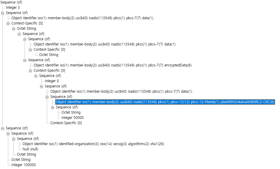 encryptedData 구조에 pbeWithSHAAnd40BitRC2-CBC 알고리즘이 default로 사용되는 것을 알 수 있습니다.